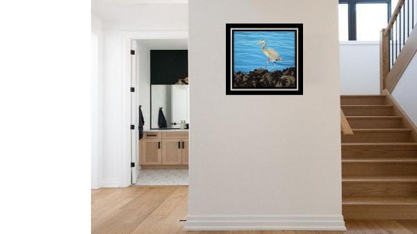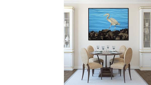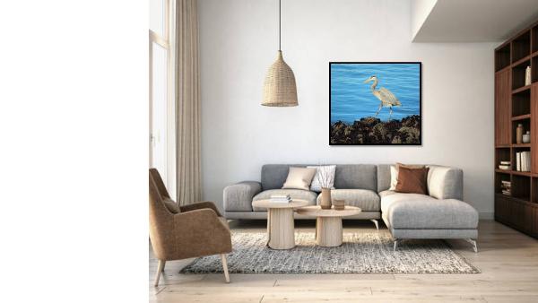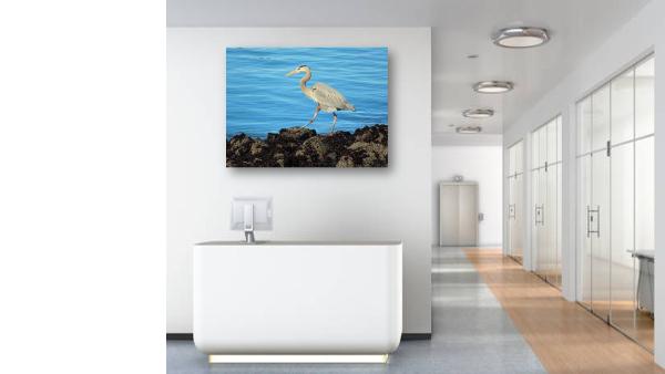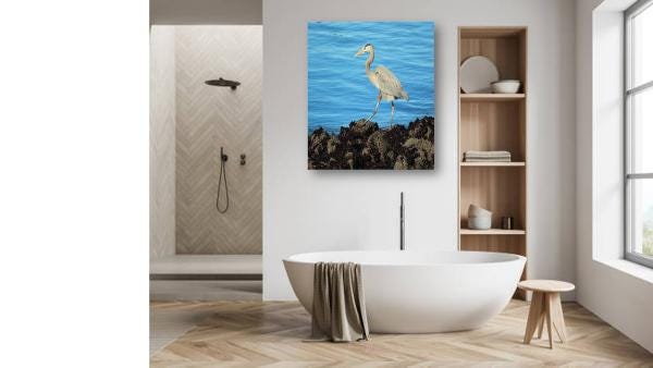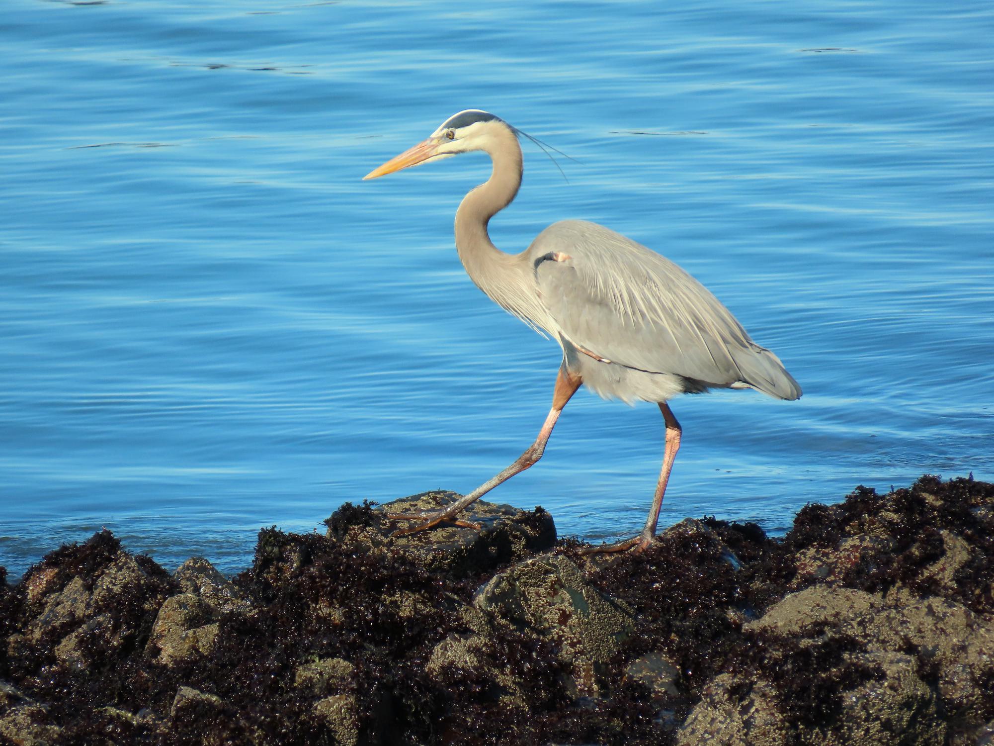 Stunning photo of the young Blue Heron by the San Francisco Bay. With its elegant neck arched and feathers shimmering in the sunlight, it seemed to dance to the rhythm of the gentle waves lapping against the shore.