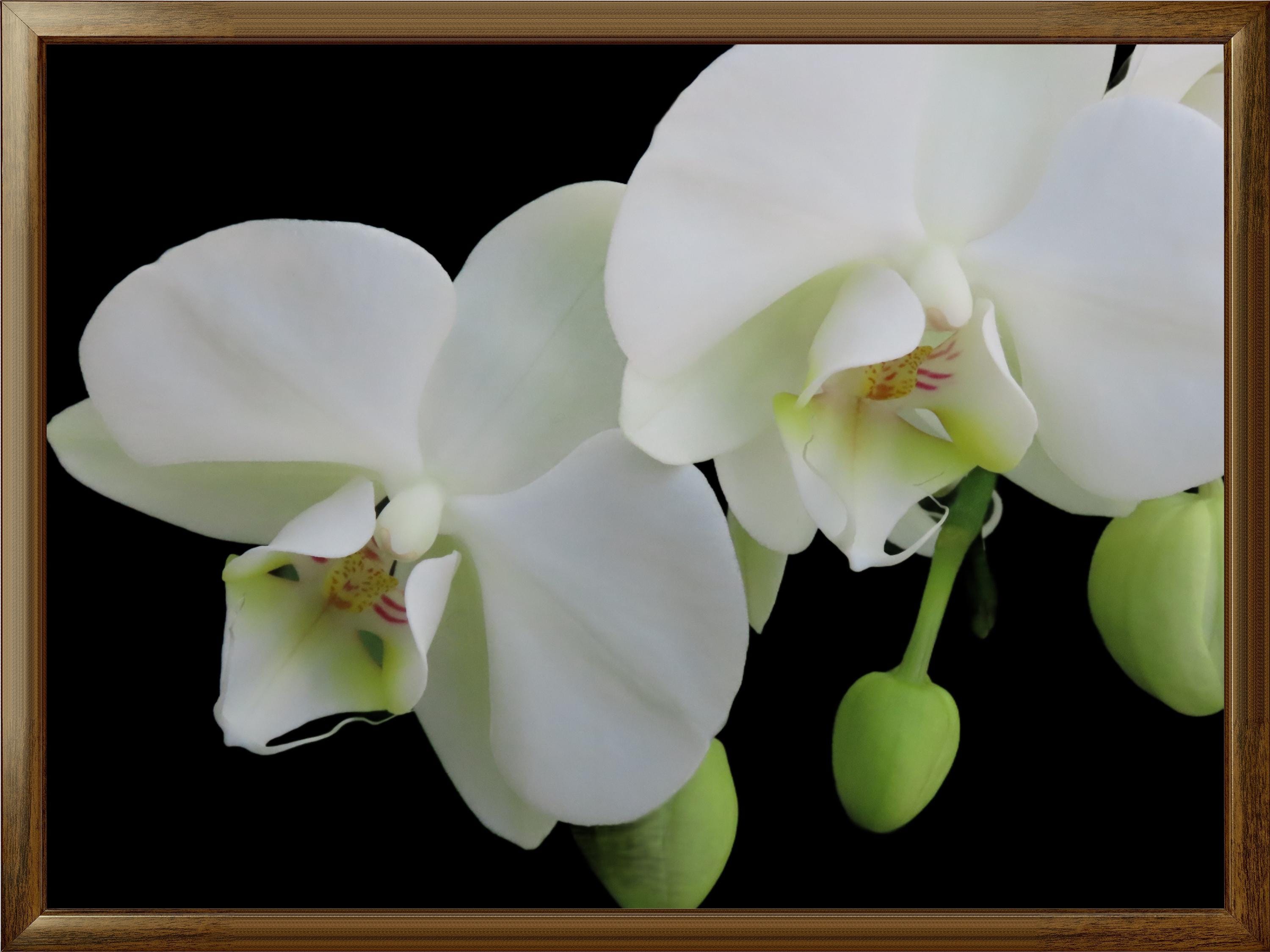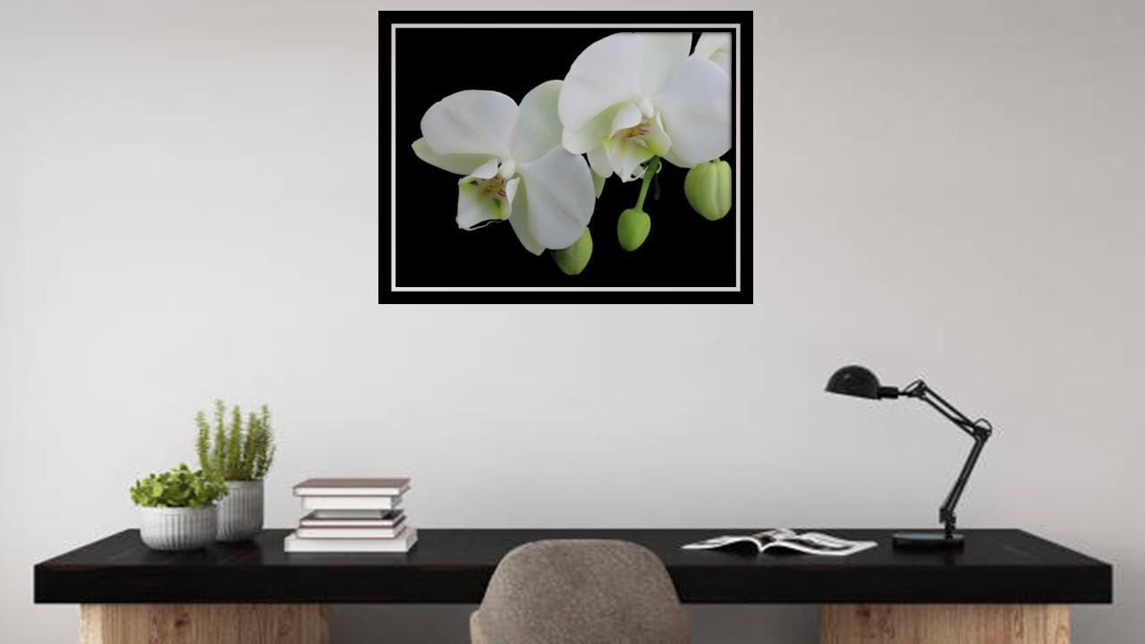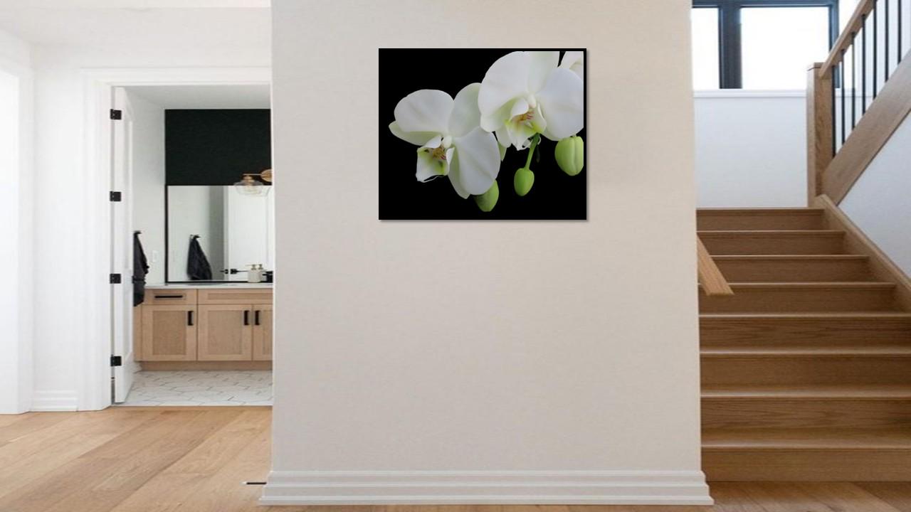 The striking contrast of a white orchid against a deep black background creates a dramatic and stunning visual impact. The luminous petals of the orchid stand out brilliantly, their delicate beauty accentuated by the rich darkness surrounding them. This bold color pairing evokes a sense of elegance and sophistication, drawing the viewer's attention to the intricate details of the flower.