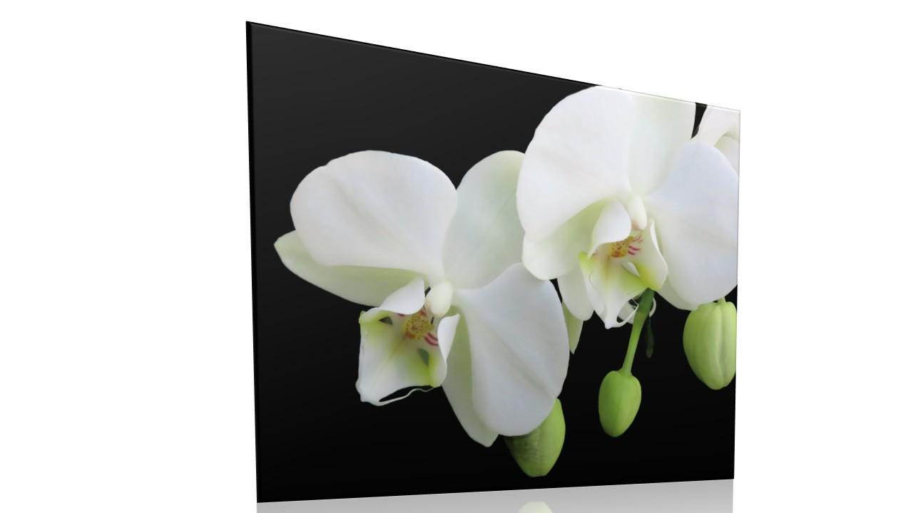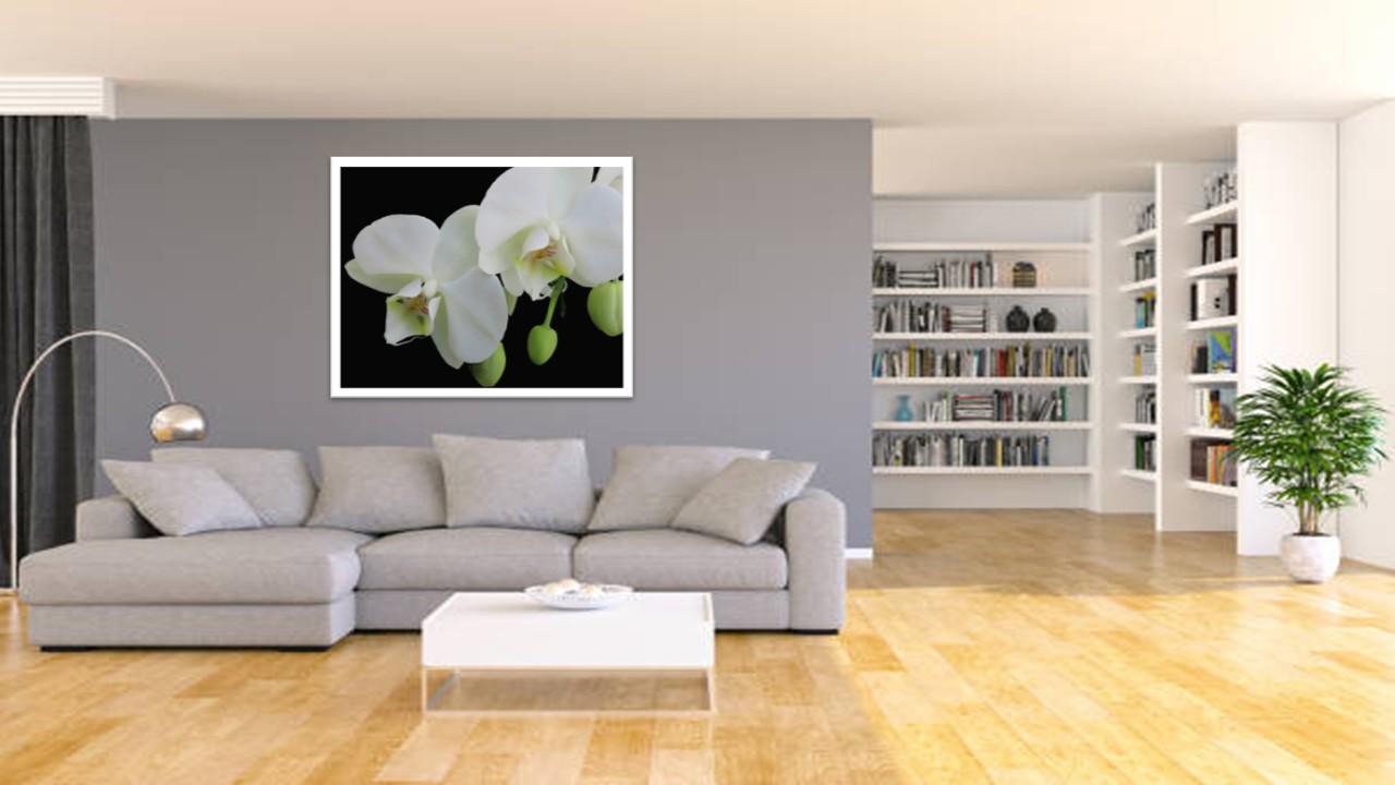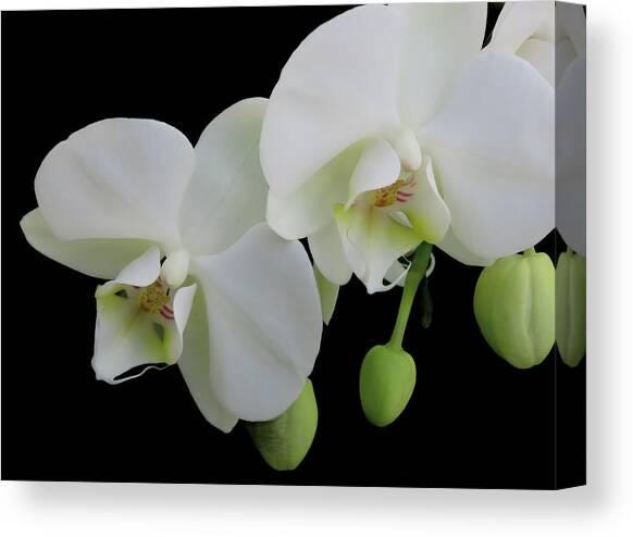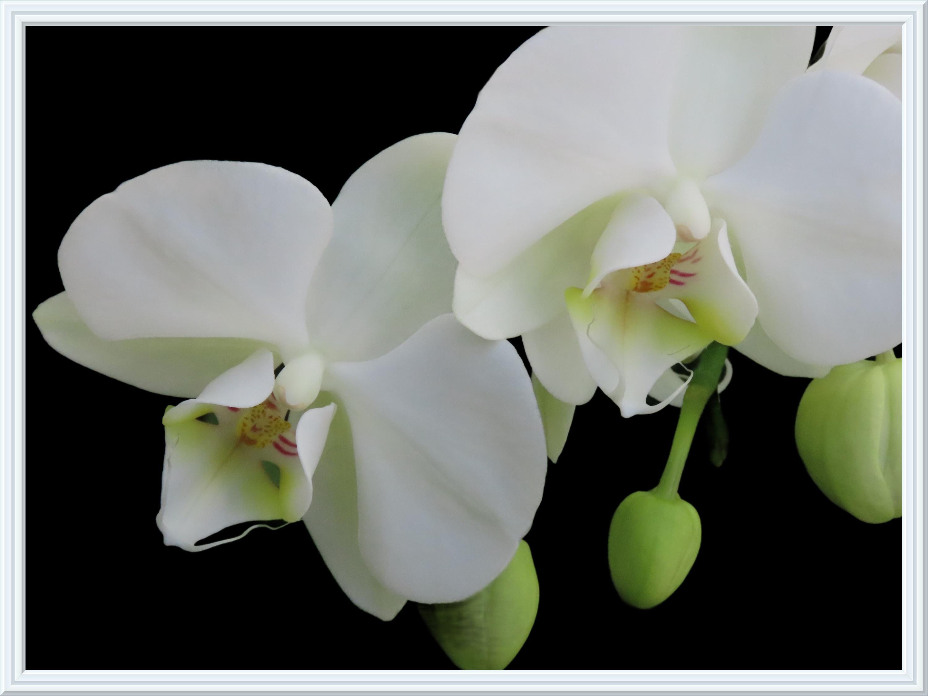 The striking contrast of a white orchid against a deep black background creates a dramatic and stunning visual impact. The luminous petals of the orchid stand out brilliantly, their delicate beauty accentuated by the rich darkness surrounding them. This bold color pairing evokes a sense of elegance and sophistication, drawing the viewer's attention to the intricate details of the flower.
